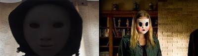 I have chosen a character from the opening scene of Strangers, this is because both of the characters have similar features, but there are a few differences. The main difference between the two characters is that the character from The Missing is a stereotypical teenager because of the clothing he is wearing, and you can tell that the character from Strangers is a girl because of the long blonde hair. One of the first similarities is that both of the characters are masked. Whereas the character from the film Strangers has an edited masked to show that she is a girl character. They have done this by adding make-up to the mask (blusher). This is a difference to our character because we have only made our mask plain white as it’s a male character. Also the clothing of both characters are different because our character is wearing a hooded jacket where as the character from Strangers is just wearing a plain green shirt Both characters have similar roles within the films, acting as the killer throughout the film, moving from scene to scene.